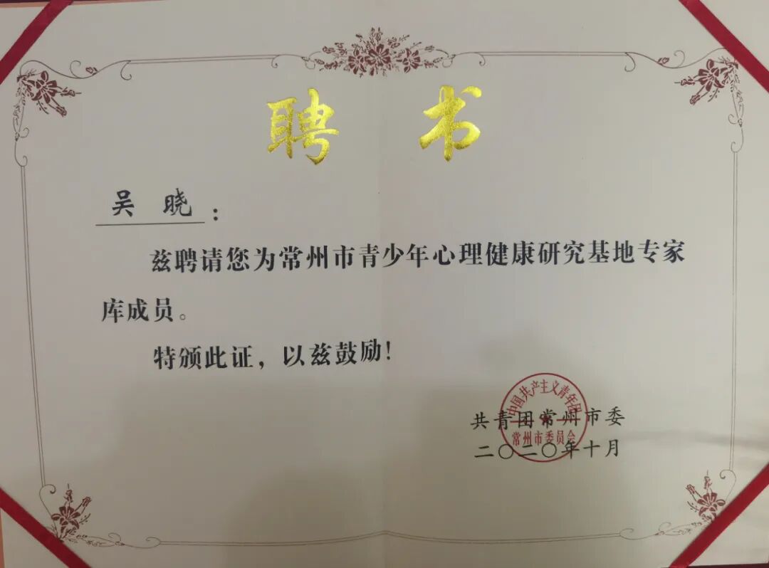 会上宣布省心理卫生协会精神分析专委会与常州团市委合作,携手建立“常州市青少年心理健康研究基地”,我中心创始人吴晓主任受聘成为基地专家组成员。